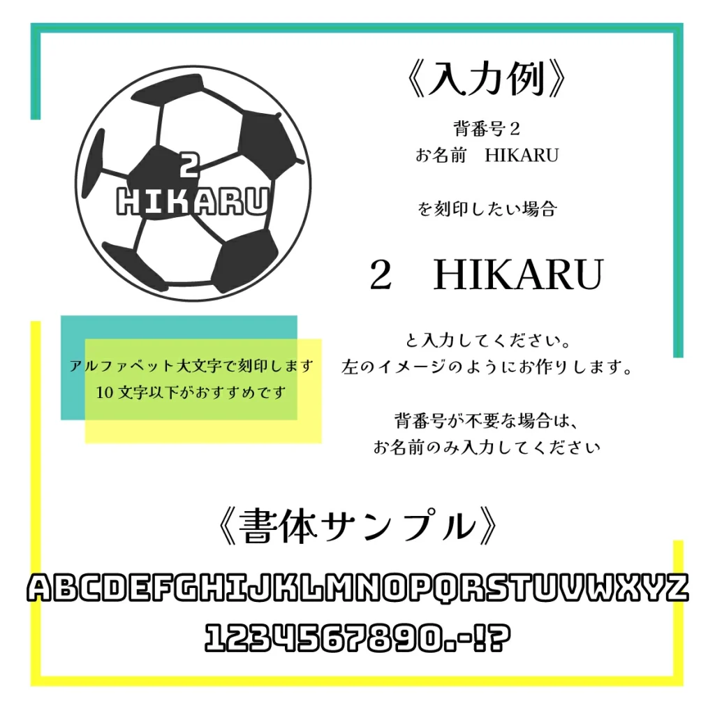 3. 刻印したい文字をアルファベット大文字で入力。背番号の刻印も可。背番号を入れる場合は、2段で配置します。