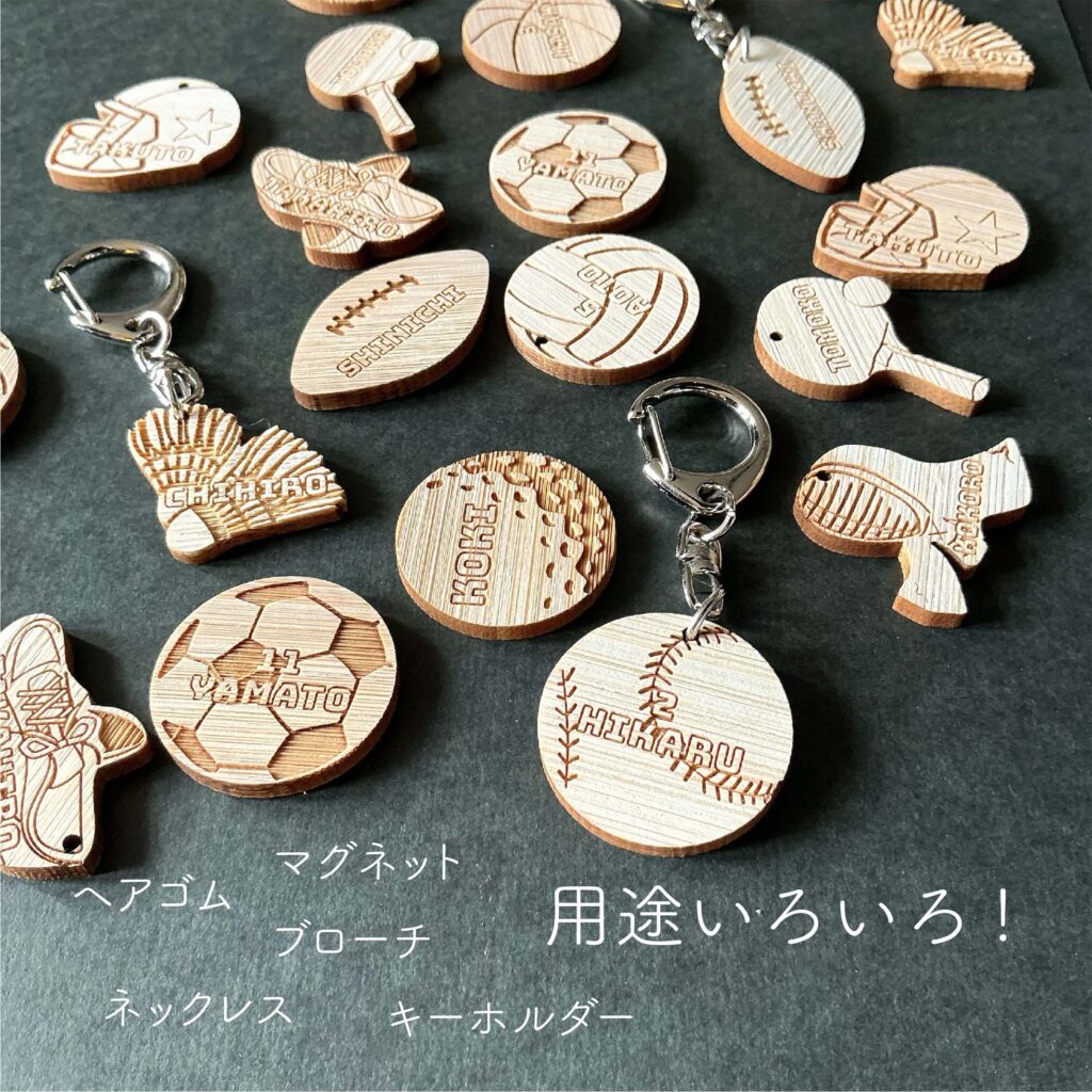 国産の竹で出来た、スポーツをモチーフにしたキーホルダーやマグネットです。