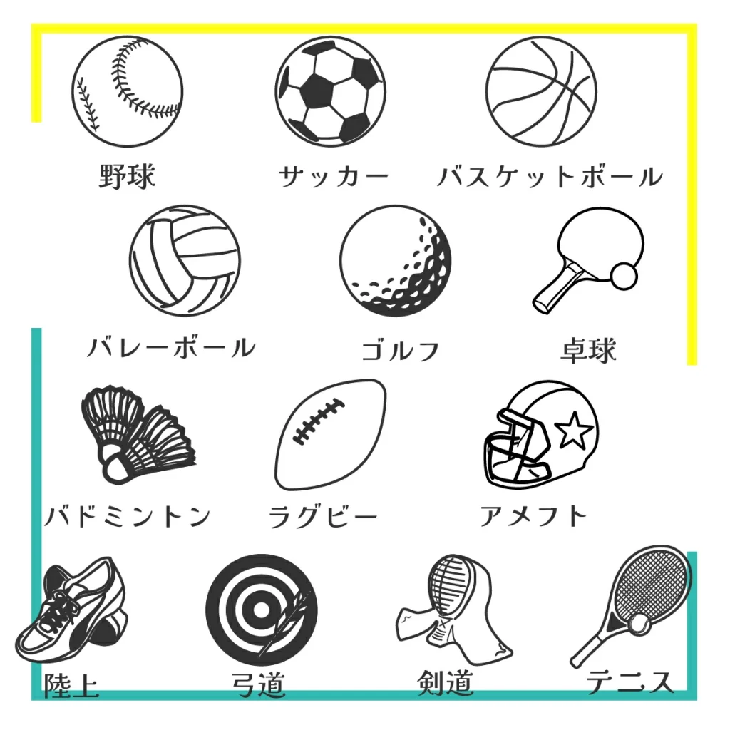 野球 サッカー バスケットボール バレーボール ゴルフ 卓球 バドミントン ラグビー アメフト 陸上 剣道 弓道 テニス
