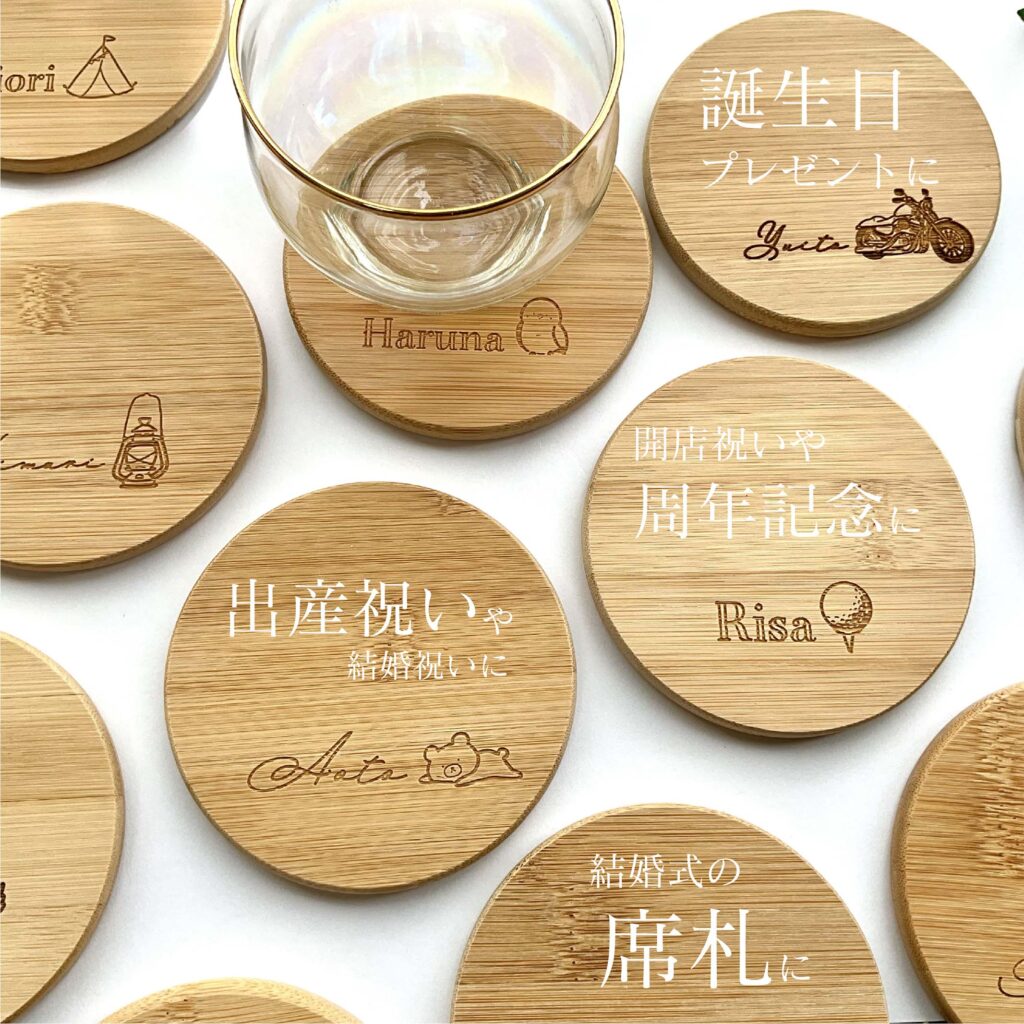 ☆名入れ無料☆6種のキャンプイラスト竹製コースター(丸)
